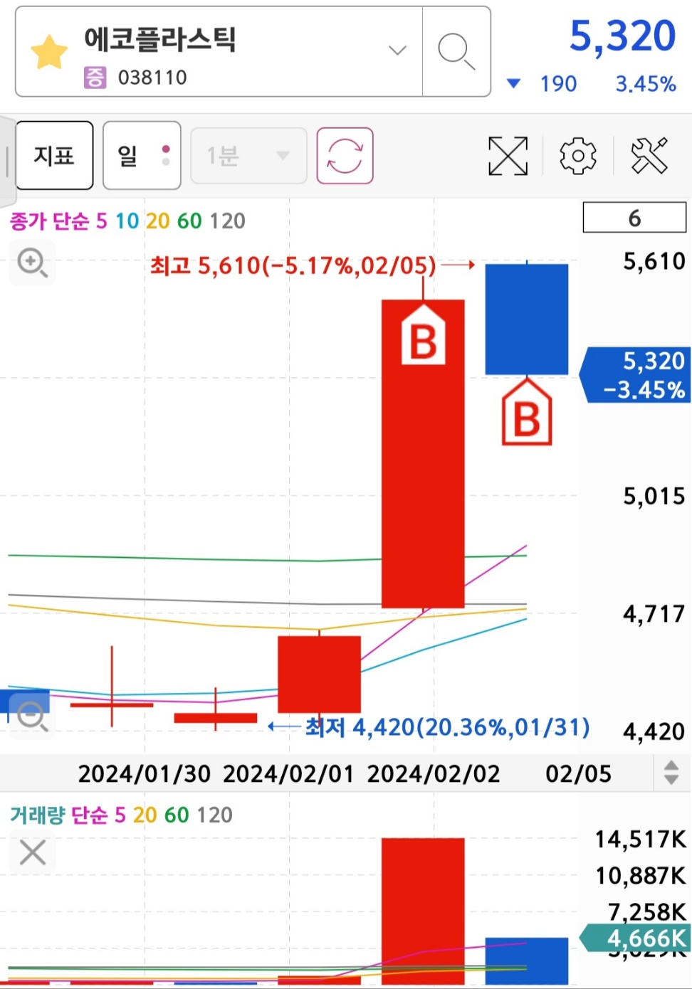 전고를 넘지 못하면, 다시 한번 눌릴 가능성이 있다. 최근 거래 중인 자동차 관련주인 에코플라스틱의 매매 일지를 공유해보려고 한다.